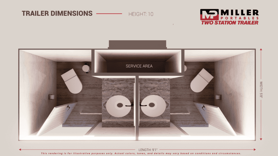 Dependable and built for daily use on long-term projects, this 2-Station Restroom Trailer delivers a hardworking sanitation solution crews can count on. Designed with durability in mind, it provides clean, comfortable restrooms with climate control and easy access — keeping your team productive and satisfied throughout the job. Trust Miller Portables’ professional setup and service for your extended rental needs.