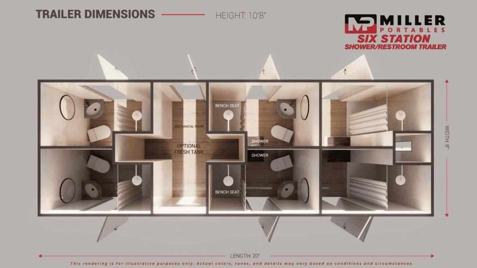 Provide premium comfort and convenience at your next event with a 6-Station Shower/Restroom Combo Trailer. Each of six private rooms includes a shower, toilet, and sink, all within a climate-controlled unit featuring interior and exterior LED lighting. This versatile trailer delivers comfort and hygiene in one sleek, self-contained solution — perfect for weddings, festivals, outdoor celebrations, and any gathering where guests need both restroom and shower facilities.