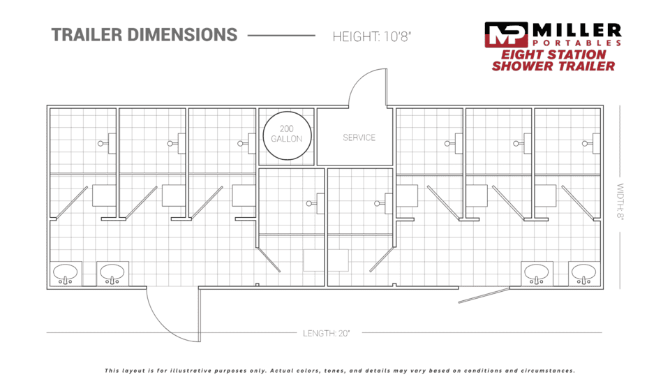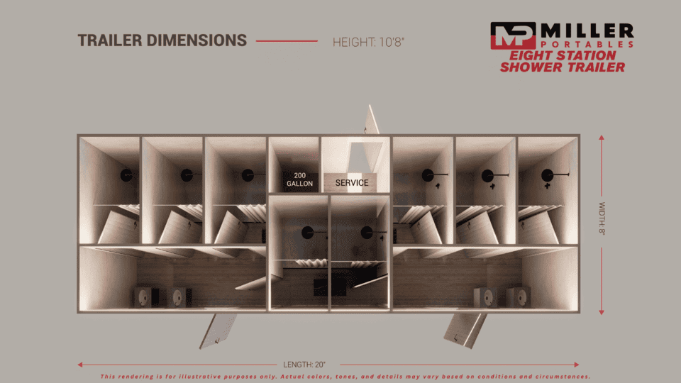 The trailer has eight individual shower stalls, offering ample capacity to support larger crews on daily work sites.