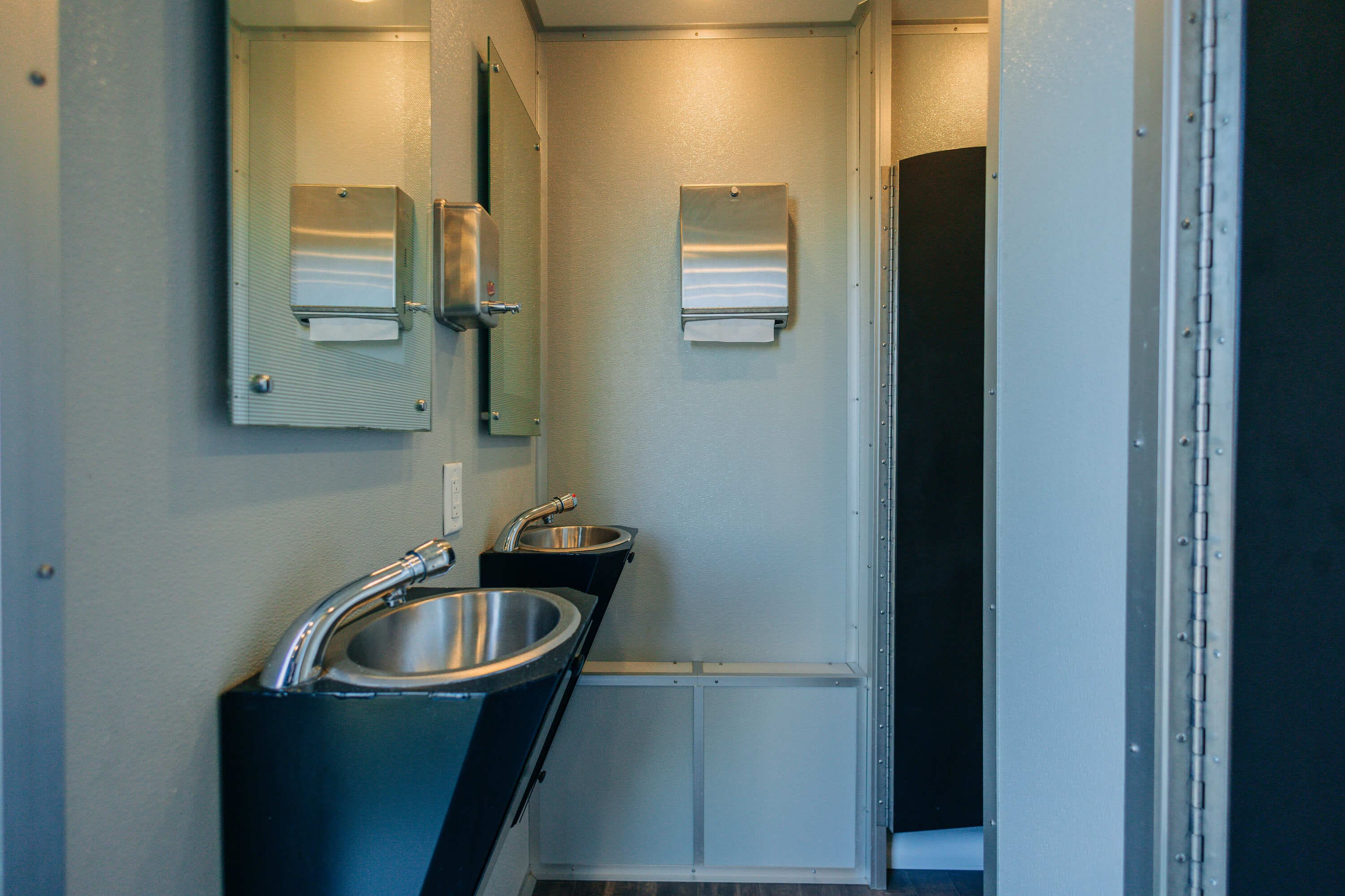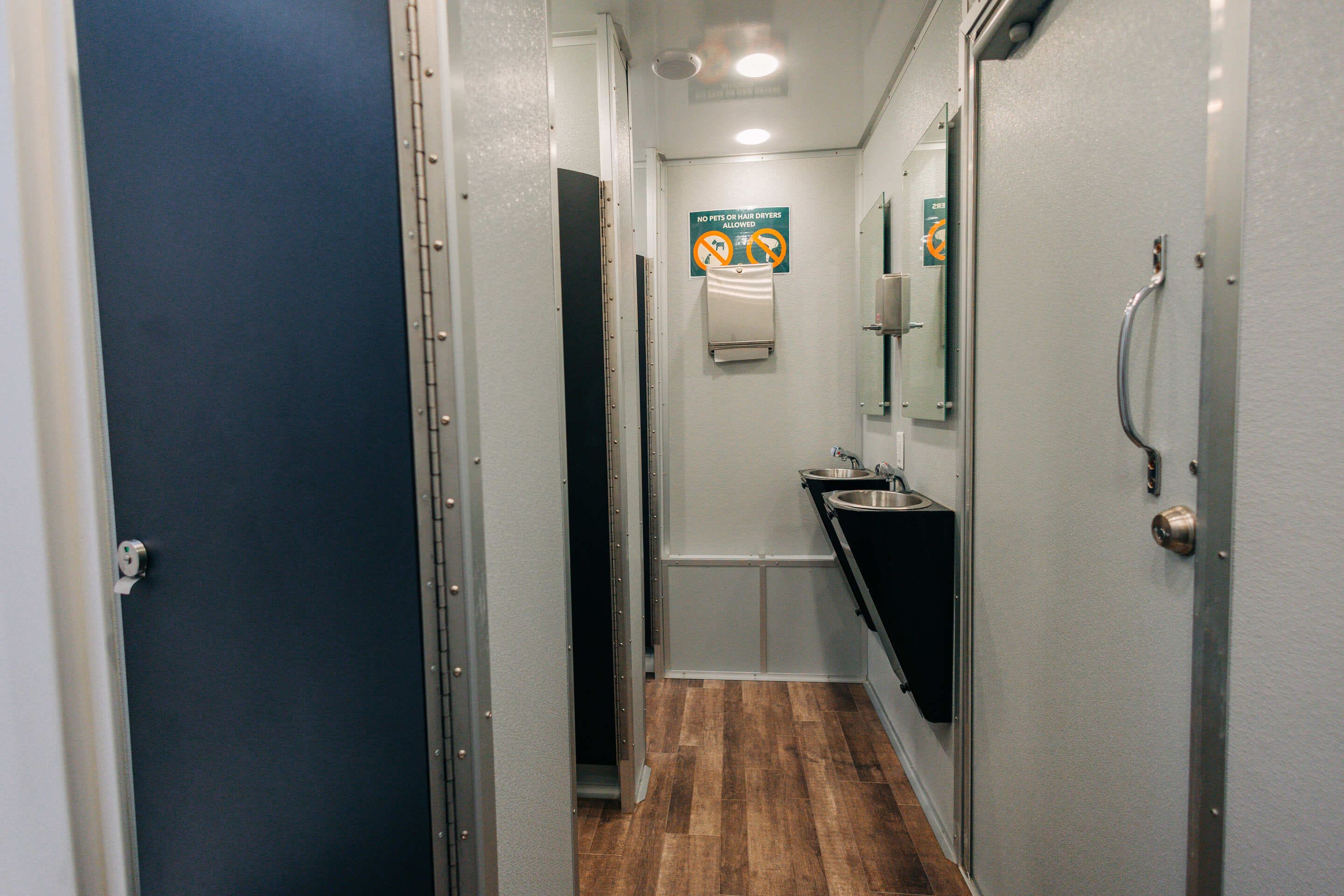 Spacious restroom trailer designed for high-traffic events and job sites.
