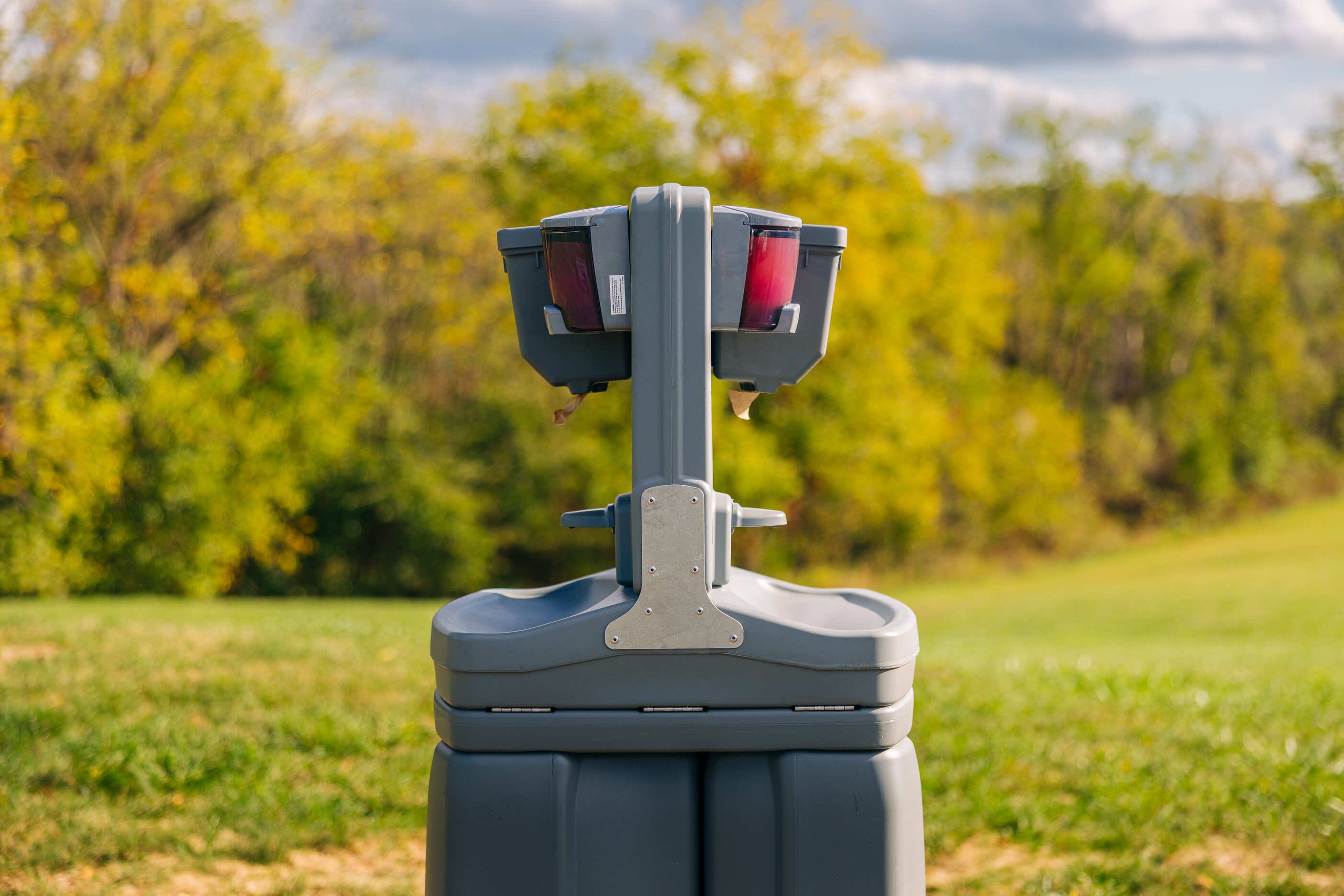 This two-station portable handwash unit features a clean, streamlined design built for reliable performance. Compact and easy to transport, it fits conveniently alongside portable restrooms and can be positioned quickly using built-in lift handles. The unit includes two soap dispensers and two paper towel dispensers to support proper hygiene at job sites and events.